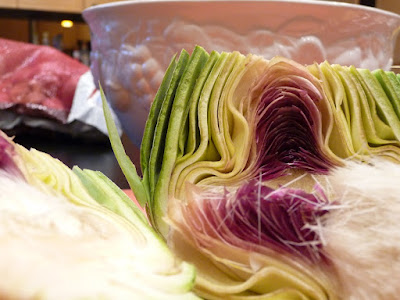 Fried artichoke hearts ala Vito DePalma. This method is still being fine-tuned for greatness to achieve the identical final product as my maternal grandfather, Vito. Emily is coaching me in artichoke handling and etiquette (or is that eat-i-quette)?
